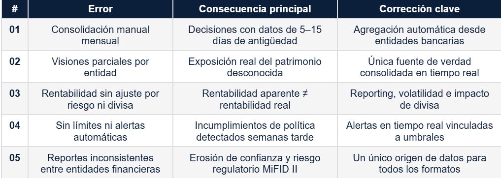 Esta fragmentación no es solo una incomodidad operativa. Es una fuente sistemática de errores. Cuando cada entidad tiene su propia visión del patrimonio, nadie tiene la visión completa. Y si nadie la tiene, nadie puede gestionar el riesgo de concentración, la exposición a divisa o la liquidez global con precisión.